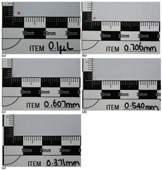 Images of stain sizes (a) 0.1 μL stain, (b) stain produced with 0.706 mm wire, (c) stain produced with 0.607 mm wire, (d) stain produced with 0.540 mm wire, (e) stain produced with 0.371 mm wire.