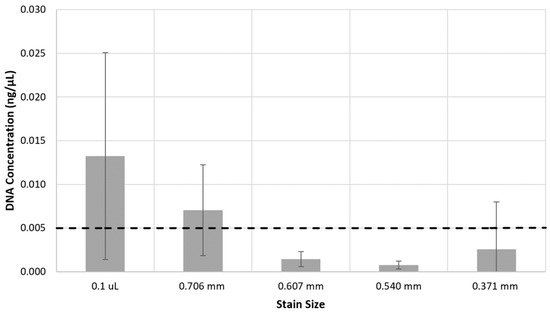 Stain size versus DNA concentration across ten replicates. The dashed line represents the 0.005 ng/μL concentration threshold observed to produce full STR profiles in this dataset. Error bars represent standard deviations.