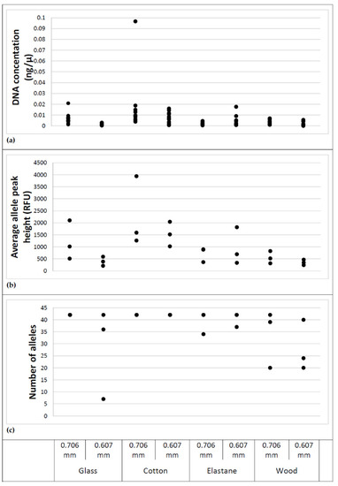 - Verdon, T.J.; Mitchell, R.J.; van Oorschot, R.A.H. The influence of substrate on DNA transfer and extraction efficiency. Forensic Sci. Int. Genet. 2013, 7, 167–175. [Google Scholar] [CrossRef] [PubMed]