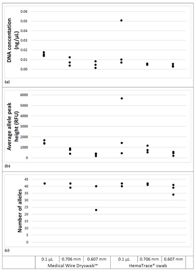 Our results demonstrate the feasibility of obtaining reportable DNA profiles from swabs of minute blood stains that have been subjected to HemaTrace® analysis. Consistently high numbers of reportable alleles were obtained down to 0.005 ng/μL of DNA, or 0.075 ng of template DNA per PCR reaction, with allele peak heights exceeding the laboratory RFU thresholds at this concentration. This concentration of 0.005 ng/μL was consistently observed in blood stains from 0.1 μL blood volumes and those produced with the 0.706 mm diameter wires.