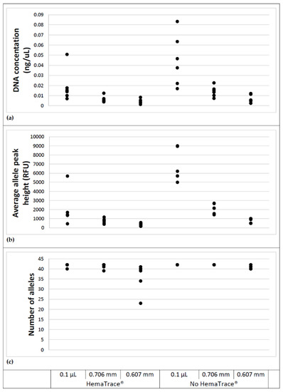 Comparison of; (a) DNA concentration, (b) average allele peak height and (c) number of reportable alleles (bottom) for stain sizes and whether or not HemaTrace® processing occurred prior to DNA analysis.