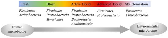 Firmicutes and Bacteroides are the most abundant phyla throughout the decomposition process [88]. Firmicutes appear to play a critical role in cadaver decomposition, as they are present at the onset of the cadaver breakdown as well as in advanced stages of decomposition. However, these two Firmicutes communities are not the same. The initial Firmicutes community is represented by bacteria native to the human body, whilst the Firmicutes community present in advanced decay correspond to Clostridiales, which take advantage of the newly available ecological conditions [82] (Figure 1).