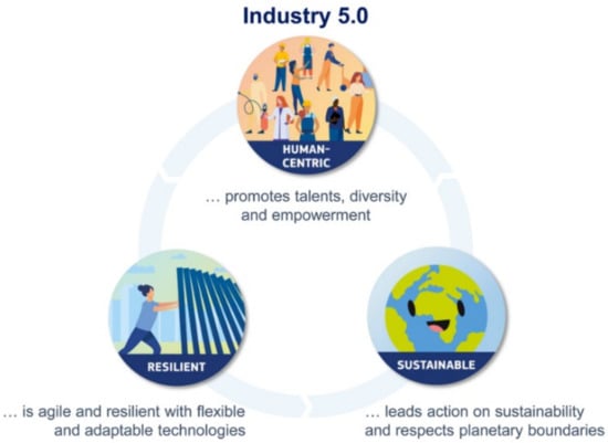 Industry 5.0 was formally established in 2021 by the European Commission [1]. This establishment was made after conducting critical analysis among scientists and industry experts in different branches of research, academia, and technology [2]. Therefore, digital transformation is slowly taking shape in the Industry 5.0 revolution. The concept of Industry 5.0 is driving research and innovation into human-centric, sustainable, and European industry. The core values of Industry 5.0, as shown in Figure 1, can be summarized into three main elements: human-centric, sustainable, and resilience. These three core values have been established to promote the diversity and talents of people, to consider the planet boundaries and environmental space, and to adapt new technologies with flexibilities.