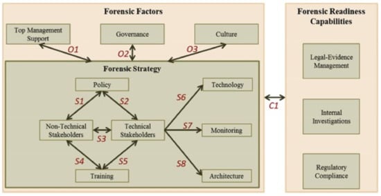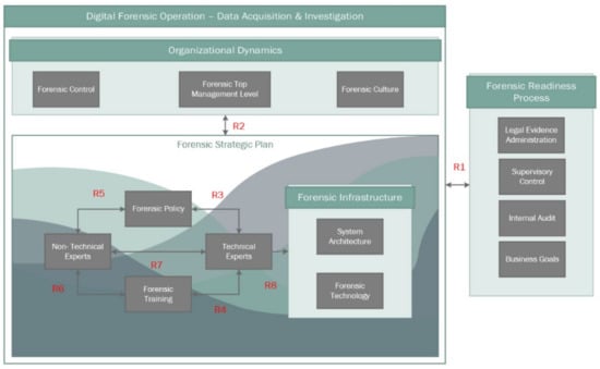 For organizations to be completely forensic ready, they must ensure readiness in operational and infrastructural aspects [22,23]. Operational readiness focuses on the individuals involved in forensics, while infrastructural readiness entails the processes of ensuring that organizational data are properly stored [24,25]. The same analogies are also highlighted by Ariffin and Ahmad (2021), who mention that elements of planning, policing, preparation, and control are necessary for the improvement of organizational forensic readiness in the era of Industry 4.0. Therefore, it should be remembered that DFR is a holistic practice and therefore other organizational dimensions should be integrated into every organization’s forensic preparation [26].