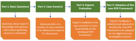Here, researchers conducted focus groups on three different groups with participants from diverse expertise in digital forensics. These experts have backgrounds either in business, consulting, law, or military professions. A total of 11 experts were selected, with each focus group consisting of about four participants (see selection criteria of experts in Table 1).
