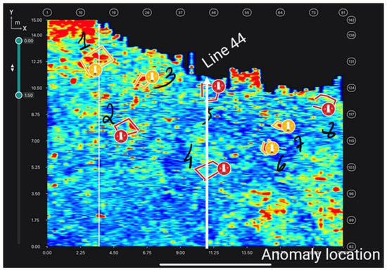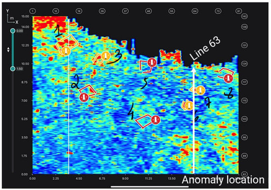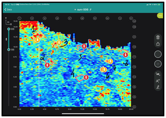 The GS 2.0 app was employed in the field during real-time data collection. The application allows the GPR specialist to add manual notations to the C-scans to mark anomalies in the data (Figure 8).