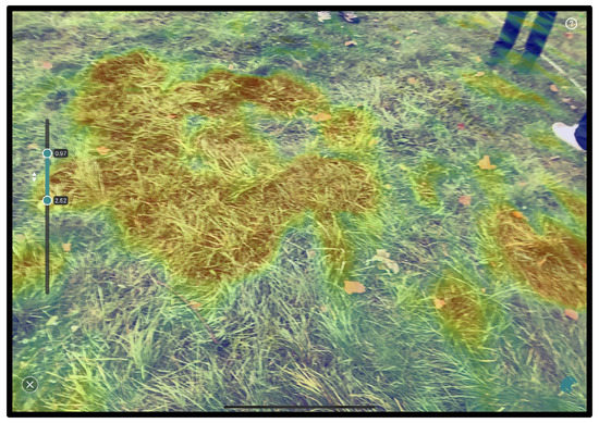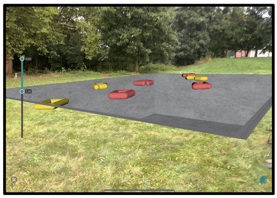 Traditionally, the possible burial locations would be marked using a measuring tape relating to the area scan corners to the ground. This is standard procedure for GPR surveys over smaller areas. GPS coordinates can be used to facilitate marking possible burial sites, but this is often time-consuming. We were able to employ an augmented reality (AR) application. This feature made it possible to show the exact location of each identified burial on the surface in real-time (Figure 9, Figure 10 and Figure 11).