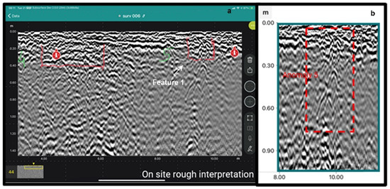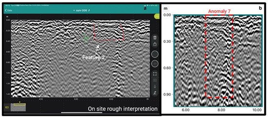 (a). Manual notations indicating Feature 2 in real-time data results, as identified by the GPR expert. (b). Post processed results of B-scan transect of Feature 2 (Anomaly 7), Wrocław, Poland, police compound. 21 September 2021 (edited by F.C.).