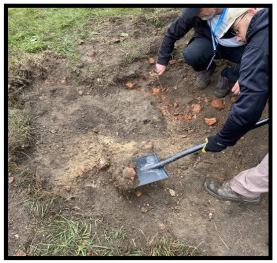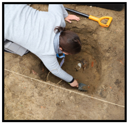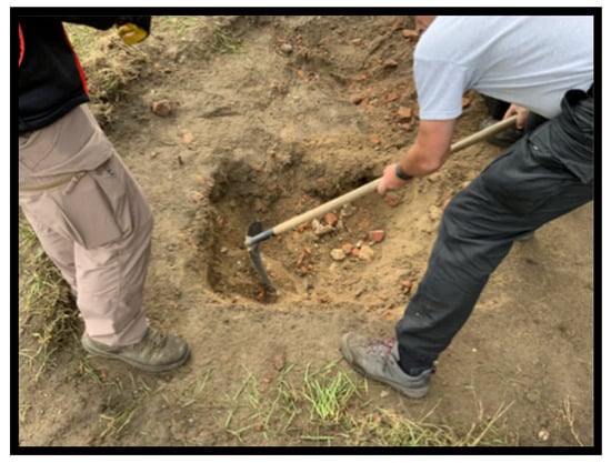 The original workshop date was scheduled for April 2020, and preparations began in October 2019. Two features were constructed on the premises of the police compound. Feature 1 was a replica of a single pit grave, so a plastic skeleton, metal, wood, and plastic were deposited in an excavated pit (Figure 1). The pit was rectangular in plan, and its dimensions were 1.63 m in length, 0.62 m in width, and 0.80 m in depth (Figure 2). Feature 2 was a small oval pit, 0.82 m long, 0.52 m wide, and 0.55 m deep. It contained a plastic replica of a human skull, animal bones, and metal artefacts. Both pits were backfilled with material extracted during digging, made up of sand mixed with humus and a significant amount of brick rubble (Figure 3).