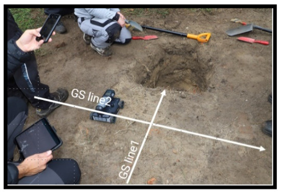 Some possible locations of burials were visible in real-time data (Figure 8), but it was agreed that the final results should be presented only after careful analysis and accurate marking of the graves’ locations, so that the excavation teams could start their part of the exercise the day after the GPR survey.
