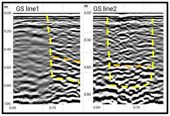On the first day, non-invasive research was performed. Two teams with GPRs carried out surveys (Figure 4). A magnetometer and a multifunctional camera (including thermal imaging) mounted on a drone were also used. Below, we discuss the results of the GPR research conducted by F.C.