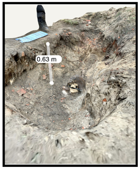 This grave did not contain a complete skeleton, but pieces of bones (a plastic skull and real faunal bones, including pig and horse) and metal. This type of material can create mixed reflections that are easily be confused with the reflections created by bricks (Figure 24, Figure 25 and Figure 26).