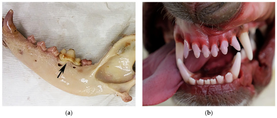 (a) Dog, case 1. Pink discoloration of multiple mandibular premolar and molar teeth. Note that the carnassial tooth was unaffected (arrow); (b) Dog, case 2. Pink discoloration of the upper incisor teeth and right lower canine tooth.