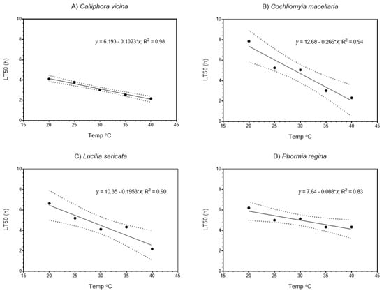 Relationships between LT50 (lethal time to 50% survivorship) and temperature (°C) for four species of blow fly: (A) Calliphora vicina, (B) Cochliomyia macelleria, (C) Lucilia sericata, and (D) Phormia regina. Dotted lines indicate 95% confidence limits.