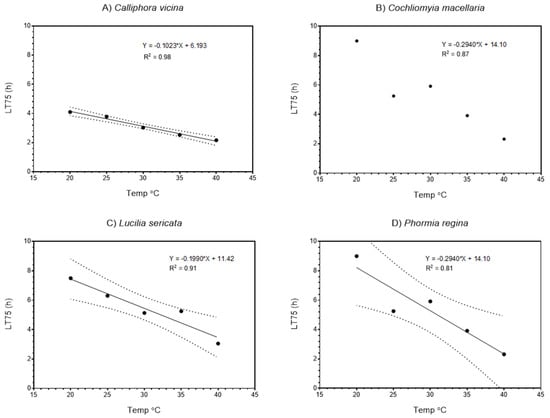 Relationships between LT75 (lethal time to 75% survivorship) and temperature (°C) for 3rd-stage larvae of four species of blow fly: (A) Calliphora vicina, (B) Cochliomyia macelleria, (C) Lucilia sericata, and (D) Phormia regina. Dotted lines indicate 95% confidence limits.