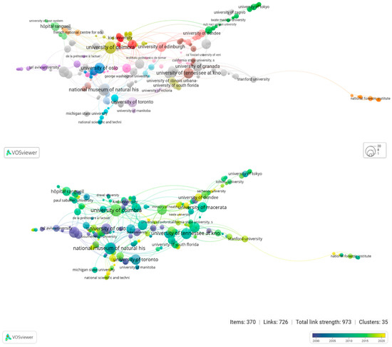 All co-authored documents, with at least one collaborative paper among institutions, were included in this analysis. This resulted in 35 clusters, as shown in Figure 2. The institutions with the highest co-authorship network included the University of Coimbra, the National Museum of Natural History, Case Western Reserve University, the University of Toronto, the University of Tennessee, the University of Oslo, the University of Milan, and the University of Edinburgh: all located in Europe and North America. The collaboration was not direct in all cases, but intermediated with other academic institutions with lesser publication profiles. Moreover, smaller collaborative networks occurred within and between non-Western institutions, primarily with Brazilian and Asian institutions.