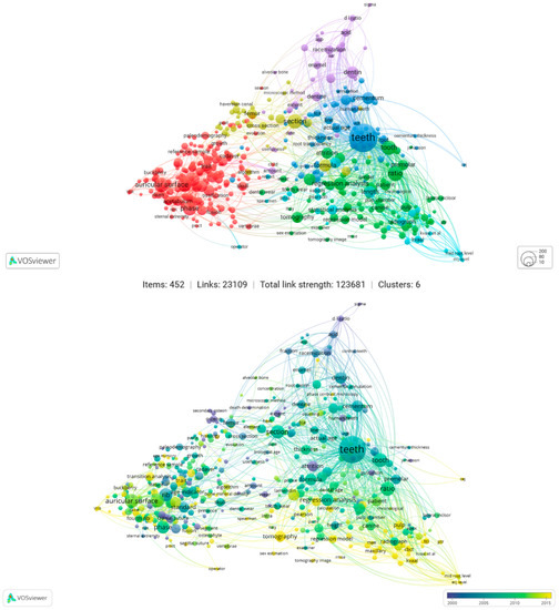 Figure 5 also shows that, although analysis of the metamorphosis of the pubic symphysis and the auricular surface first appeared in the 1920s and 1985, respectively, it continues to be a topic of research in more recent years. This exemplifies, to perfection, the continuous assessment and adaptation of more classical age-at-death methods. The same observation is true for the term ‘Suchey Brooks method’, which has, since its publication in 1990, continued to influence age estimation research, and has been revisited by subsequent research, having benefited from technological development [67]. After 2015, in yellow also, the co-occurrence of terms is biased towards the applicability of technological development, and newer statistical approaches to aging research. These are exemplified by terms such as ‘Transition analysis’, ‘Tomography’, ‘Tomography image’, ‘CT scan’, ‘Cone beam’, ‘Pulp’, Pulp volume’ [41,67,68,69].
