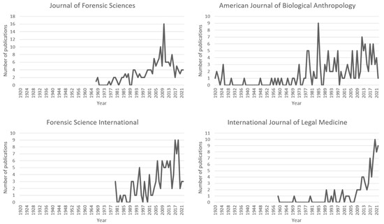 Table 3 shows the TOP5 most cited articles from the TOP4 journals. The profile of the articles per journal varies, as does the number of citations. For example, the two most cited articles published by the Journal of Forensic Sciences were those of İşcan et al. [5] and İşcan et al. [7] on age estimation by observing the sternal extremity of the fourth rib. While the most cited article published by the American Journal of Biological Anthropology was that of Lovejoy et al. [60] on the metamorphosis of the auricular surface of the ilium. The Forensic Science International’s most cited paper is a review article on aging by Cunha et al. [71], which evaluates and makes recommendations for age estimation based on various factors such as the level of preservation of the body, elements present, and sex. Finally, The paper by Ritz-Timme et al. [72] on assessed aging methodologies and made recommendations is the most cited paper published by the International Journal of Legal Medicine. We have two papers on methods and two reviews as major research articles as the most cited in these highly referenced journals.