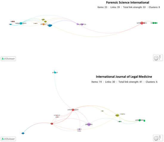 Network visualization of co-authorship by institutional countries for publications of the Forensic Science International and the International Journal of Legal Medicine. The interactable maps are accessible at: Forensic Science International https://app.vosviewer.com/?json=https://drive.google.com/uc?id=1dy7RVu39t4y7UyjpAvtIhnVQsKLIAp1_; International Journal of Legal Medicine https://app.vosviewer.com/?json=https://drive.google.com/uc?id=1glHeo3fqa56IEGXq9aq586JRmgmjtojU (Accessed on 16 January 2023).