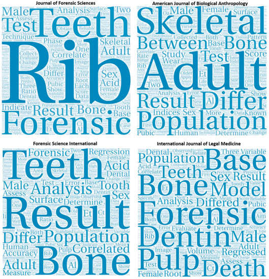 Figure 10 illustrates the most frequent terms for the TOP4 journals. Data showed that the Forensic Science International and the International Journal of Legal Medicine both had a similar frequency for ‘Bone’ and dental-related terms (Figure 4). While the term ‘Rib’ appeared more frequently in the Journal of Forensic Sciences. For the American Journal of Biological Anthropology, terms associated with bone analysis and the term ‘Population’ appeared more frequently. This suggests that the Journal of Forensic Sciences and the American Journal of Biological Anthropology placed a greater emphasis on publishing aging methods that examined age-related bone degenerescence than the other two TOP4 journals.