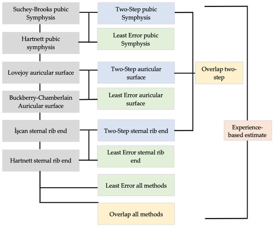 Another strategy for estimating age is a “two-step” approach, in which a preliminary assessment of the skeletal indicator (pubic symphysis, sternal rib end, auricular surface) was made to decide which method’s range would be recorded as the final age estimate [3,4,7,8]. Each indicator was first assessed using the original method, and if it was assigned to a lower phase of the method (Suchey–Brooks I–III, İşcan 0–5, and Lovejoy 1–4), then that method’s results were recorded; however, if the individual was assigned to a higher phase of the original method, then the associated revised method (Hartnett pubic symphysis, Hartnett rib, or Buckberry–Chamberlain) was applied and its results were recorded. Using the two-step strategy, three final age estimates were recorded for each individual—one for each indicator assessed in this study.