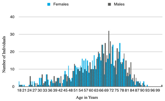 The average age of the females in this sample was 62.65 years, with the majority of participants falling between the ages of 50 and 85 years (Figure 1).