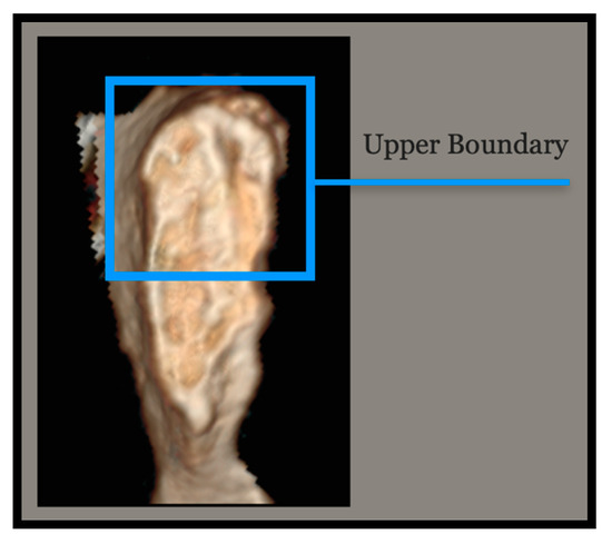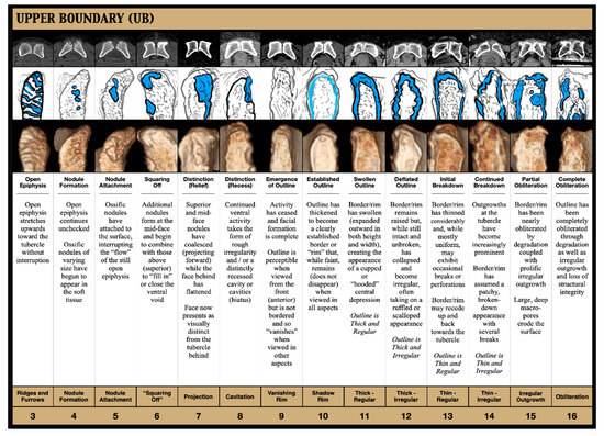 The Upper Boundary (Figure 2) consists of the upper half of the face and includes the crest and tubercle behind. In evaluating the Upper Boundary, focus should be placed on activity, shape, and condition. This may include, but is not limited to, whether the epiphysis is open, whether ossific nodules are present, whether the face has flattened, or whether the face is bordered (Figure 3). Axial images were included in the guide for this AOI as they were found to be particularly diagnostic in this area.