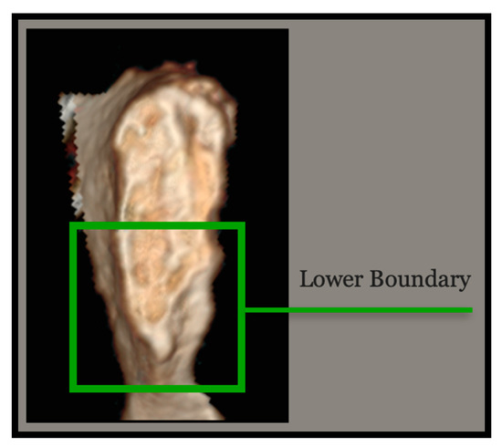 The Lower Boundary (Figure 4) consists of the lower half of the face and includes the inferior edge and the descending ramus. In evaluating the Lower Boundary, focus should be placed on facial distinction, border shape, and condition. This may include, but is not limited to, whether the epiphysis is open, how far down the ramus activity extends, whether ossific nodules are present, whether the face has flattened, or whether the border is “✓-”, “V-”, or “U-” shaped (Figure 5).