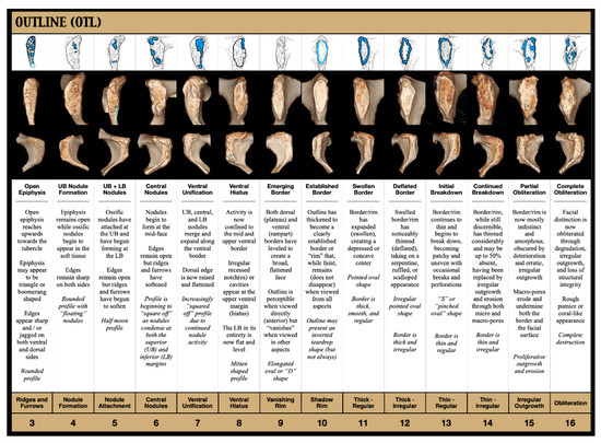 - Gilbert, B.M.; McKern, T.W. A Method for Aging the Female Os Pubis. Am. J. Phys. Anthr. 1973, 38, 31–38. [Google Scholar] [CrossRef]