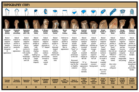 The final AOI was that of “Topography” (Figure 10). This AOI comes into relief when the symphyseal face is tilted back (generally between 45 and 90 degrees) and viewed from an inferior to superior “raked” angle. When it is positioned in this way, diagnostically significant shapes and contours become visible and may be assessed (Figure 11).
