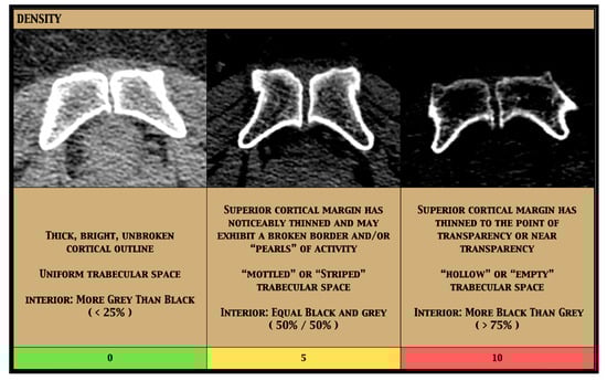 After piloting the technique, it became clear that certain individuals were being consistently, yet predictably, under-aged and that those individuals tended to be the ones exhibiting the greatest loss of density on their axial views. Because of this, it was decided that accommodation should be incorporated as an adjustment to the overall outcome. For the females, this adjustment took the form of the following three categories: high density, which carried a weight of “0”; medium density, which carried a weight of “5”; and low density, which carried a weight of “10” (Figure 12).