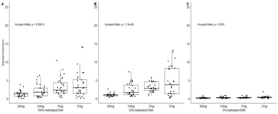 Standard deviation of the measured methylation rate of the CpG sites comprised in the five targets, for three replicates of 100%, 50% and 0% methylated DNA standards. In each case, measures were performed for four different DNA quantities from the conversion bisulfite step (300 ng, 150 ng, 75 ng, 37.5 ng).
