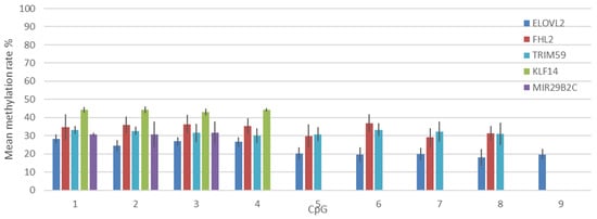 The methylation rate of the 32 CpG sites comprising the five targets was measured for 12 replicates from the bisulfite conversion step in the previously chosen condition for the 50% methylated DNA. As shown in Figure 2, the obtained SD ranged from 1% to 7% depending on the CpG site and the target itself. This can be due to the quality of the pyrosequencing and directly due to the sequence of the target itself. A general increase in the SD can be observed as the distance of the CpG from the beginning of the sequence increases. This can be partly explained by the increasing background signal in the sequence [15]. The large SD observed for the FHL2 target is caused by one replicate only, which was not removed from the analysis, because a good sequence quality was obtained. An error in preparation cannot be excluded. The minimum SD was obtained for the KLF14 target’s CpGs. Importantly, the observed methylation rate differs from 50%, and the difference varies according to each target. The methylation of ELOVL2 CpG sites can reach 20%, whereas the values obtained for the KLF14 target are above 40%. Each target presents a bias in the measured methylation rate. This contrasts with the results obtained in the primer selection (Supplementary Data S1). It might be partly explained by a different preparation of the methylation control, but this could not be checked.