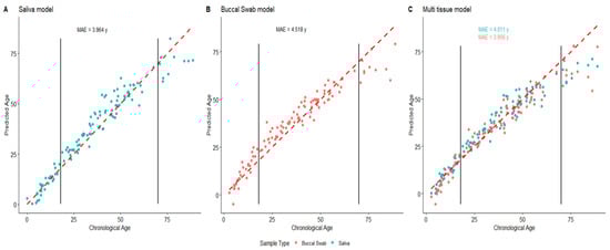 Age prediction for the saliva (blue) and buccal swab (red) samples using tissue-specific models (A,B) and the multitissue model (C). Perfect predictions are represented by the dashed red line. Vertical black lines represent the 18- and 70-year-old limits from the original model.