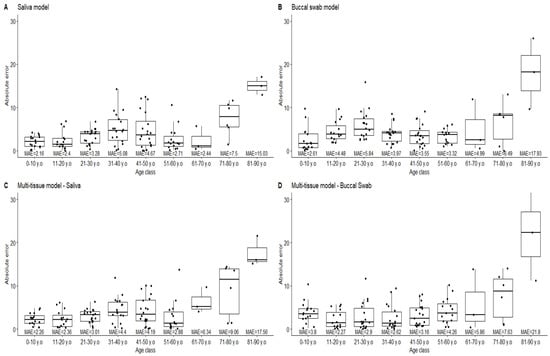 Several observations can be formulated when observing the age prediction for individuals from 0 to 88 years. The first one is the loss of linearity for the age prediction under age 18 for the different models, where the buccal swab model and the multitissue model are the most impacted. This might be caused by the loss of the linearity of the correlation for TRIM59 and ELOVL2. This induces an underestimation of the age of the youngest individuals (under 10 years of age). The same underestimation of age can be observed for the oldest subjects. Additionally, the error rates are largely increased for individuals over age 60. Notably, the increase in the error rate observed in our data implies a breach in the residuals hypothesis for linear regressions (Supplementary Data S3). Although it can be partly explained by the underrepresentation of elderly people, it is well known that the methylation rate of a particular CpG site can be modified by the environment [22,23]. Thus, even if the correlation of the methylation rate to the age is still true, the effect of such exogenous variations has to be taken into account when estimating the age of the oldest individuals, and the communication of the result has to be carefully carried out. Several solutions could be proposed to address this issue. One of them could be the determination of age-class (e.g., 5 or 10 years)-dependent statistical indicators, and another could use a threshold when predicting age (e.g., not providing results above age 60). On the other hand, the errors in predictions decrease for the youngest individuals thanks to a lower effect of the exogenous methylation modifications. This is particularly observed in the case of the saliva-specific model (Figure 5). Unfortunately, for the other models, the loss of the linearity of the predictions compensates for this decrease in errors with an underestimation of the age for the youngest individuals. Here again, predicting the age of young individuals would have to be carefully carried out given this issue. The use of a second threshold for the youngest individuals could represent one of the solutions despite the major importance of age estimation in the young individuals (e.g., migratory context). The loss of linearity in the correlation can also be addressed by using mathematical transformations while building an age-prediction model [24].