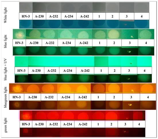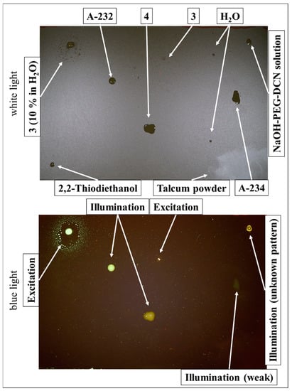 First, experiments were carried out using white and blue papers as clear and dark surfaces. One droplet of 10 µL of each sample was deposited on the respective surface, which was then exposed to all available light conditions (175 wavebands originating from ten singular LED lamps and combinations of up to three at the same time) in a dark room. The following effects were recognized while observing each waveband with its respective filter (Table 1 and Table 2):