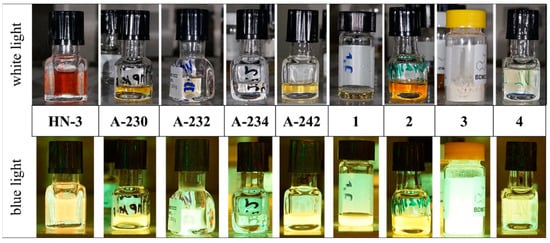 Bluegreen light (475 nm peak emission) again shows excitation-like interaction for HN-3 and substance 3, as well as comparable contrast results for the white paper surface as shown for blue light. For the dark surface, however, A-230 and substance 1 were hardly visible, and A-232 and substance 4 were only slightly visible. With green light (520 nm peak emission) for the white paper surface, the same results were achieved as with blue-green light, whereas for the blue paper surface, only HN-3 and substance 3 were clearly visible.