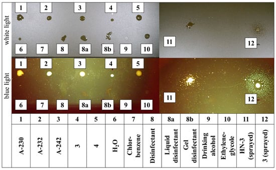 The results of the “proof of concept” tests are displayed in Figure 1. The first line shows a normal white light picture of the droplets. They could be seen by the naked eye. However, there is no way to discern them from water or other colorless liquid substances. The second line shows the interaction of the substances with blue light (445 nm peak emission). HN-3, substances 2 and 3 show excitation behavior, and all other investigated substances show illumination behavior. This condition works for blue and white paper surfaces. When adding UV (365 nm peak emission) to the blue light, displayed in line 3, the background interaction of the white paper surface reduces the contrast considerably, making it close to impossible to discern the target material from the background. For the blue paper surface, the addition of UV light has a negative effect on the visibility of the contaminated areas.