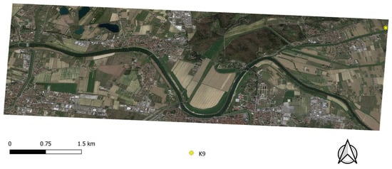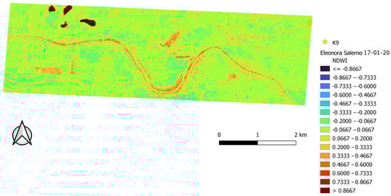 Figure 6 clearly shows the presence of six distinct negative points, indicating anomalies to be investigated. As with the Italian case, due to a series of variables, such as meandering, sediments, depth, precipitation, etc., it appears difficult to calculate in advance the travel speed of the body during the search. For this reason, during the search, prioritizing and specifically checking this limited number of anomalies identified by the NDWI analysis would have been necessary before embarking on a massive and time-consuming seabed scan. Based on the location of the stranded body’s discovery, the result appears consistent with the area identified by one of the points (Figure 6) [31].
