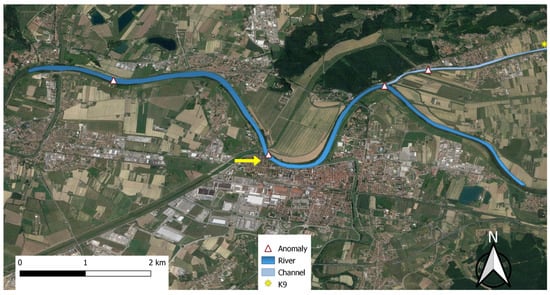 The figure highlights the anomalies (white triangles) identified following the NDWI analysis. The four anomalies were found both inside the canal (light blue) and within the river (dark blue). It is worth noting that the body was found in the area highlighted by the second triangle from the left (see the arrow).