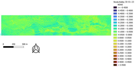 Using this image, the NDWI analysis was performed, which in this case also highlighted not only water consistency but also changes within the water basins (Figure 5). The value scale reports both positive values indicating a high presence of water and negative values linked to significant variations in water content or the presence of non-water elements within water basins. In this case as well, the focus was on searching for negative values within the river course of the Wyre River by querying the GIS system.