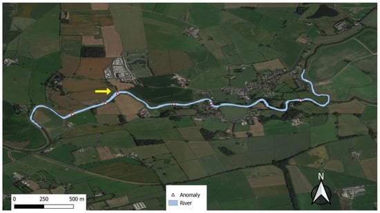 The figure highlights the anomalies (white triangles) identified following the NDWI analysis. The six anomalies were found within the river (blue). It is worth noting that the body was found in the area highlighted by the third triangle from the left (see the arrow).