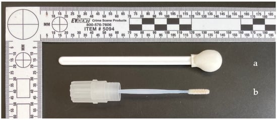 - Sherier, A.J.; Kieser, R.E.; Novroski, N.M.; Wendt, F.R.; King, J.L.; Woerner, A.E.; Ambers, A.; Garofano, P.; Budowle, B. Copan microFLOQ® Direct Swab collection of bloodstains, saliva, and semen on cotton cloth. Int. J. Leg. Med. 2020, 134, 45–54. [Google Scholar] [CrossRef]