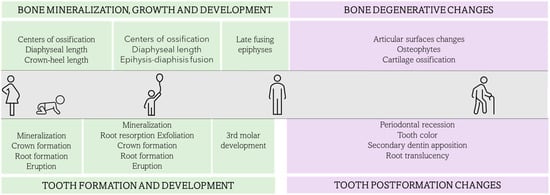 However, CBCT imaging is not always available for forensic analyses, due to its economic cost or a lack of accessibility to a CT-scanner. Artificial intelligence is the next step in age assessment. Even though this age estimation approach is still in need of further research, recent research studies show promising results increasing the objectivity of the estimations by the application of machine learning algorithms to age estimation methods [63,64,65]. Figure 1 presents the different osteological and dental age-related changes that may be used for age estimation throughout the lifespan.