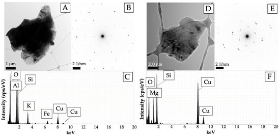 Panels (A–C) summarize a dataset for representative platy muscovite particles, with (A) being a bright-field image with a scale bar of 1 µm, (B) an electron diffraction pattern of ~(hk0) showing sharp reflections, and (C) an EDS spectrum with abundant Al, Si, and K, consistent with the presence of muscovite. Panels (D–F) summarize a dataset for representative platy talc particles, with (D) being a bright-field image with a scale bar of 200 nm, (E) an electron diffraction pattern of ~(hk0) [28] (or (h0l) [27]) showing stacking disorder, and (F) an EDS spectrum with abundant Mg and Si, consistent with talc. The Cu peak is attributed to the grid.