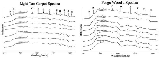 Spectra for floor materials. Carpet 1: Spectra for blush on light tan carpet, with major features and interpreted causes being (A) weak inflection at ~535 nm (Fe3+), (B) weak inflection at 700 nm (Fe3+), (C) 1205 nm (OH and C-H), (D) 1385 nm (H2O), (E) 1583 nm (C-OH), (F) doublet at 1704 and 1760 nm (C-H), (G) 1875 nm (H2O/OH), (H) 1940 nm (top) grading into 2040 nm (change in OH type), (I) 2182 nm (C-H, C-O, C=O, and N-H), (J) 2310 nm (Mg-OH, Al-OH, and OH), and (K) weak doublet at 2346 and 2376 (C-H). Pergo Wood 1: Spectra for blush on Pergo flooring, with major features and interpreted causes being (A) very weak inflection at ~535 nm (Fe3+), (B) weak inflection at 700 nm (Fe3+), (C) 1200 nm (OH and C-H from cellulose), (D) 1430 nm (OH and H2O), (E) 1720 nm (C-H), (F) 1900 nm (H2O/OH cellulose), (G) 2100 (C-H, OH, and cellulose), and (H) 2310 nm (Mg-OH, Al-OH, and OH). Spectra for blush on dark brown carpet (Carpet 2) and blush on linoleum (Linoleum) are provided in the Supplementary Materials.