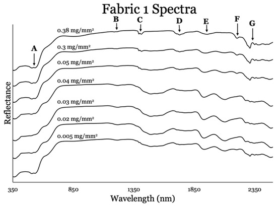 Spectra for clothing fabric. Spectra for blush on Fabric 1 (khaki), with major features and interpreted causes being (A) a doublet at 506 nm (S) and at ~535 nm (Fe3+), (B) weak feature at 1205 nm (OH cotton), (C) 1392 nm and 1418 nm (OH and C-H), (D) 1730 nm (C-H), (E) 1932 nm (H2O/OH cellulose), (F) 2200 nm (Al-OH, C-H, and C-O), and (G) 2310 nm (Mg-OH, Al-OH, and OH). Spectra for blush on Fabric 2 (denim) and Fabric 3 (white cotton) are provided in the Supplementary Materials.