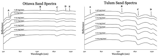 Outdoor materials. Spectra for blush on Ottawa sand, with major features and interpreted causes being (A) doublet at ~506 nm (S) and 535 nm (Fe3+), (B) 1420 nm (OH), (C) 1940 nm (OH), (D) 2117 nm (OH), and (E) 2310 nm (Mg-OH, Al-OH, and OH). Spectra for blush on Tulum carbonate sand, with major features and interpreted causes being (A) weak inflection at ~535 nm (Fe3+), (B) 1450 nm (H2O), (C) 1900 nm (H2O), and (D) 2350 nm (CO32−). Blush is below the detection limit for the experimental conditions on Tulum carbonate sand. Spectra for blush on a pine wood block are provided in the Supplementary Materials.