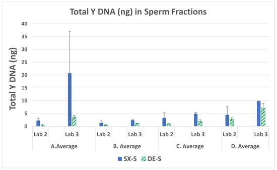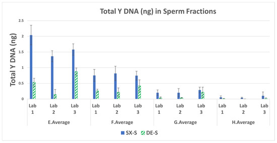 The total Y DNA (ng) in each sperm fraction was averaged for the triplicate runs for each mixture. The averages for mixtures A–D and E–H are shown in Figure 1 and Figure 2, respectively. The SX had a higher recovery of male DNA than did the DE for all samples run by the three laboratories. The average amount of DNA recovered for mixture A by LAB 3 in Figure 1 is an outlier, exhibiting double the amount of DNA placed on the swab. This may be due to some inhomogeneities in the solution during sample preparation. The lower-end sperm series in mixtures E–H were prepared with 1500 ng female and 2.5 ng, 1.25 ng, 0.33 ng, and 0.0825 ng male, respectively. Figure 2 illustrates the decrease in male DNA recovered from E to H, as expected. On average, SX recovered five-fold more male DNA than DE. A majority of the comparisons exhibited significant differences (p < 0.05) as seen in Supplemental Table S2. The fold differences in Y DNA (SX/DE) in the sperm fractions and laboratory averages are in Supplemental Table S3.