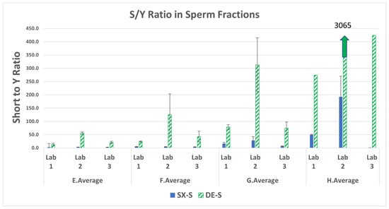 The SX resulted in lower S/Y ratios for all samples run by each of the three laboratories. This is indicative of less female carryover with SX compared to DE. Note that each laboratory had only one of the three swabs with results for the lowest sperm mixture H (25 sperm cells) processed with DE (no standard deviation bars). The DE S/Y ratios ranged from 5.4 to 183-fold higher than SX, indicating a poorer separation of female and male DNA. The fold difference in S/Y ratios (DE/SX) in the sperm fractions and laboratory averages are in Supplemental Table S4.